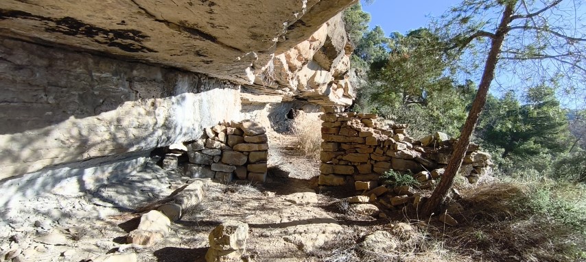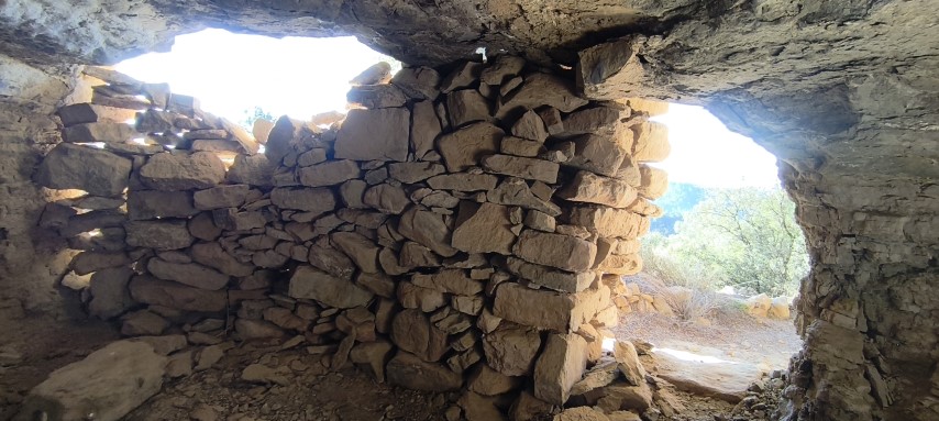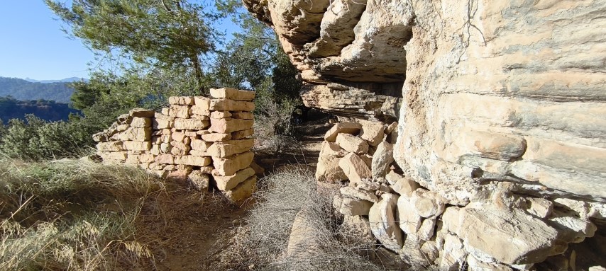 Hi ha cinc forats concentrats a l'extrem d'una de les lloses, un dels quals totalment cantoner a la llosa, com volent formar part d'un encaix. Es van trobar un parell més de forats aïllats entre les grans lloses caigudes. Era tot plegat una forma d'arranjar parapets per contenir una rampa de terra per accedir a les balmes...? eren marques dels picapedrers per trencar pedra i adobar marges de pedra seca...? o en realitat havien estat picats a l'anvers de les lloses, quan aquestes encara formaven part del sostre...?
