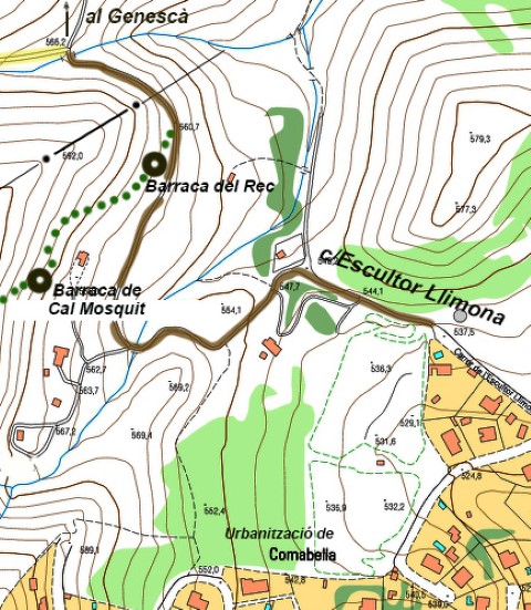 Seguint la pista que mena al mas del Genescà i quan haurem passat el darrer xalet, a la nostra esquerra trobarem un roqueter on hi ha la restaurada barraca del Rec. Seguirem amunt el marge de pedra seca que forma el rec i en aquesta direcció sud i gairebé planejant, trobarem la barraca de cal Mosquit, arrenglerada amb un marge. Sota mateix de la barraca hi ha la parcel·la i el darrer xalet de la urbanització Comabella - Genescà.