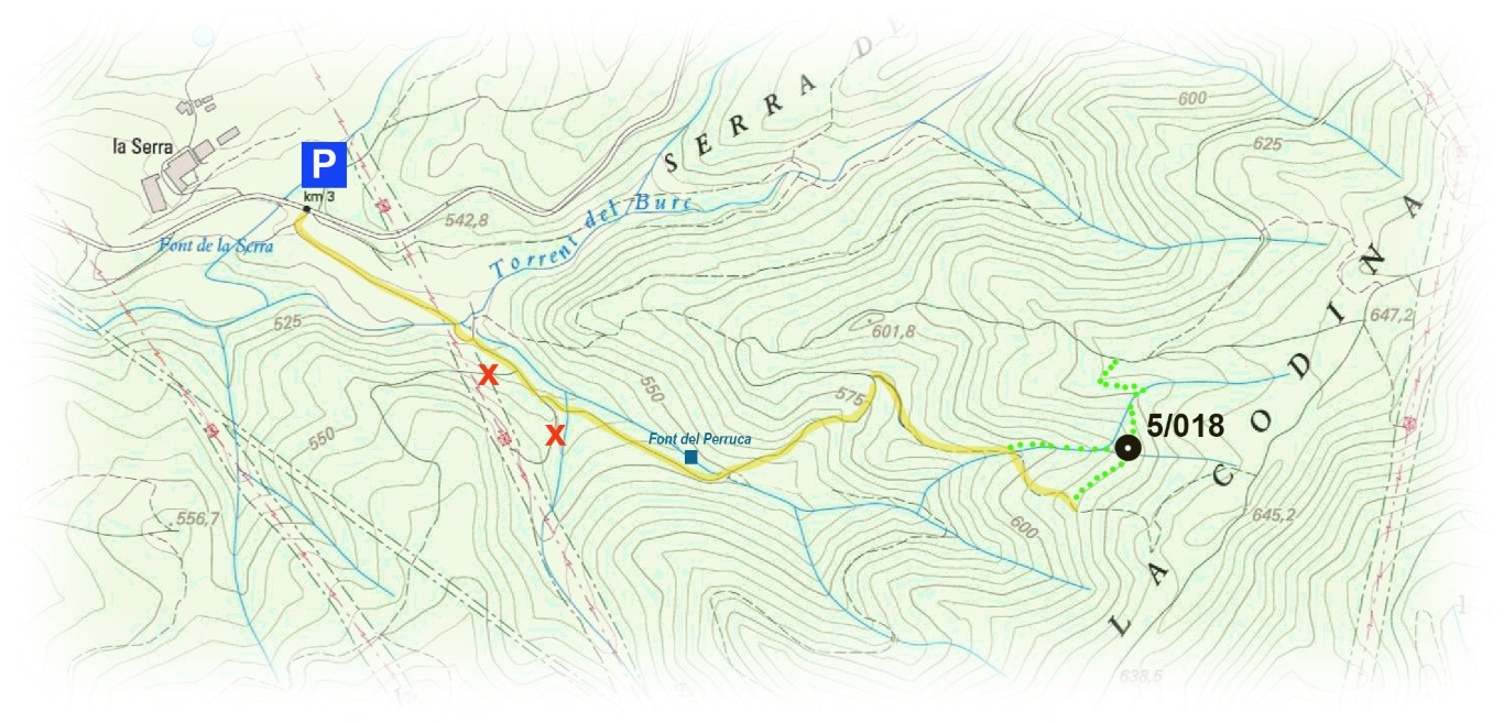 Iniciem el trajecte al punt kilomètric 3 de la carretera Savall - Gallifa, prop de la font de La Serra. Seguirem la pista que travessa els camps de La Serra en direcció al torrent de Burc. Travessarem per sota d'una línia d'alta tensió i també la llera del torrent del Burc. Tot seguit passarem de llarg el trencall a la dreta de la pista del Serrat del Savi i seguirem paral·lels al torrent tributari del Burc. Tornarem a deixar a la nostra dreta un altre trencall de pista, que és una via de manteniment de les torres elèctriques. Metres enllà - en un tram ben recte - potser trobarem la fita que indica el baixador - a la nostra esquerra - per arribar a la font del Perruca, emplaçada a la llera mateix del torrent. La nostra pista travessa el tàlveg del torrent bo i fent un revolt a l'esquerra, i s'inicia un tram de pujada. Al capdamunt de la pujada, la pista revolta cap a l'esquerra amb la intenció de planejar: en aquest punt nosaltres sortirem per la nostra dreta seguint una traça de pista abandonada per trobar tot seguit la inacabada barraca de la Catedral. Seguirem el corriol per darrere de la barraca i seguirem les pedres alineades que formen una antiga carrerada. Planejarem fins a trobar la llera d'un torrentet: el seguirem amunt fins a trobar la barraca del Pi Blanc.
