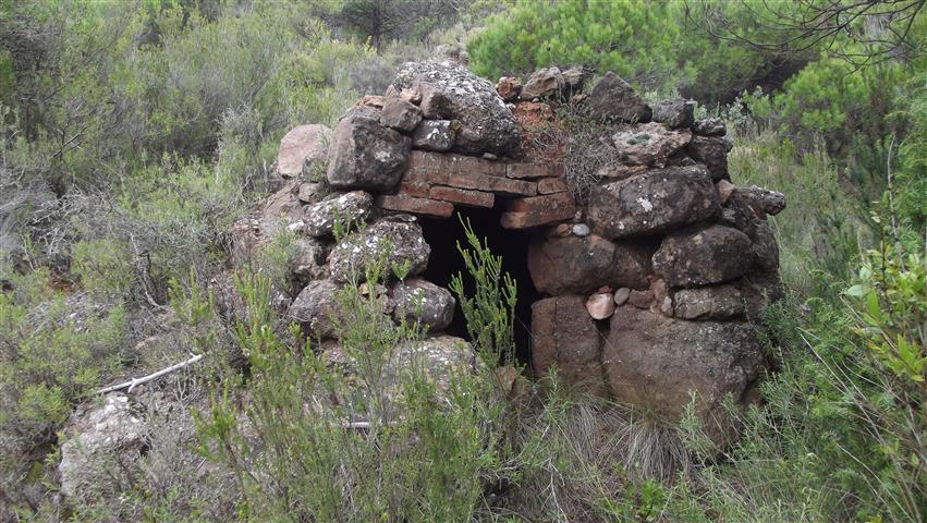 Objectes - rebaix en el muntant esquerre que suggereix la possibilitat que els maons haurien pogut servir per a un rudimentari tancament amb porta, sortida de fums a la punta nord de la construcció.