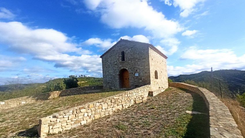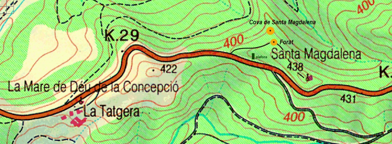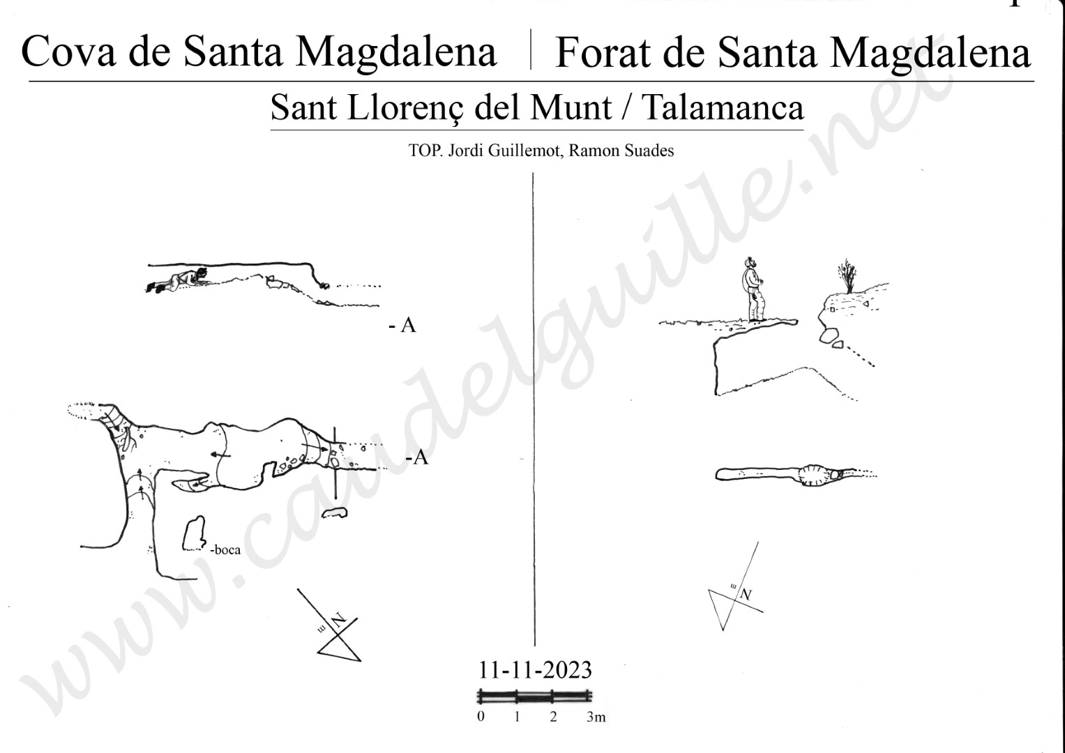 Tal i com expliquen els plafons sota sostre que trobareu abans d'arribar a la restaurada ermita romànica de Santa Magdalena (Talamanca - Navarcles, crta. BV-1221,entre Km 28 & 29) la construcció és originària de la primera meitat del s.XIII. Dos segles més tard el seu estat ja era mig ruinós a causa de terretrèmols i altres calamitats, i es va anar apedaçant fins que a finals del s.XIX va quedar definitivament abandonada. No va ser fins el 2015 que va ser restaurada de dalt a baix. Aquell abandonament del s.XIX però, havia estat l'ocasió propícia per posar a provar la llegenda que assegurava que l'ermita amagava un tresor ocult dels templers: molta gent es van dedicar a remoure totes i cadascuna de les pedres del temple, però totes, totes...? Guiat per les forces tel·lúriques que es concentren al lloc, en Ramon Suades va pensar que el tresor podria no haver estat amagat a l'ermita sinó als afores i entre el Juny de 2010 (cova) i el 2023 (forat) localitzà les dues cavitats que avui us presentem. Des d'aleshores alguns hem notat que el seu nivell de vida ha pujat notablement, per no mencionar que quan m'hi va acompanyar fins i tot va deixar que alegrement jo descobrís una moneda daurada al fons del forat...