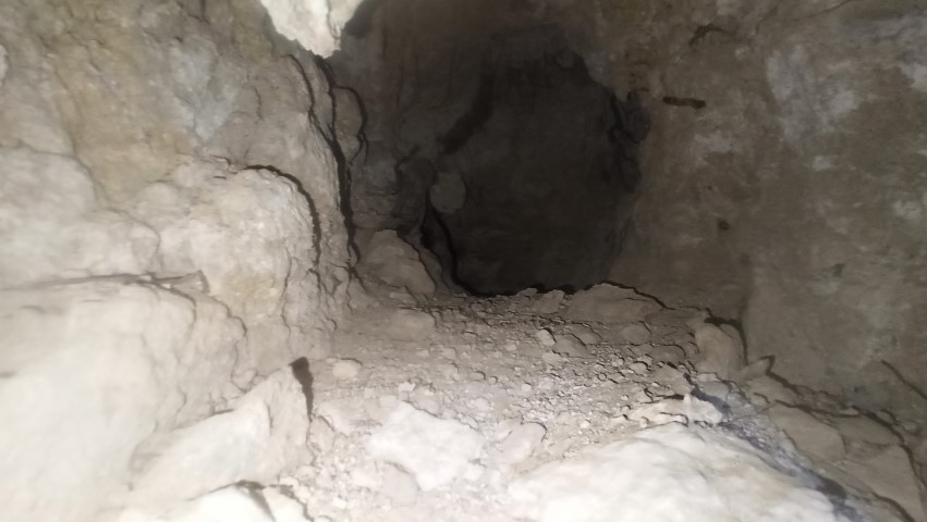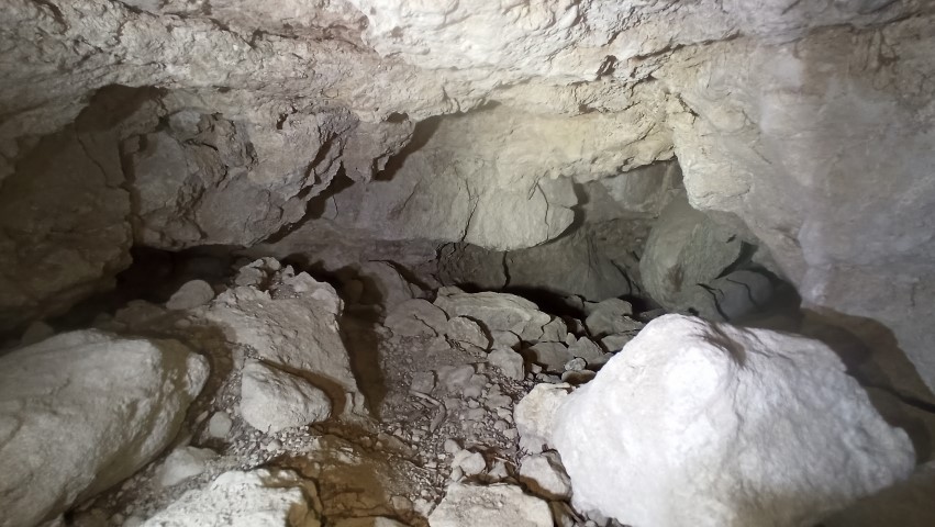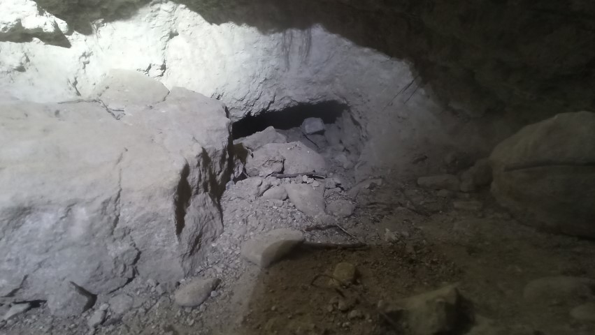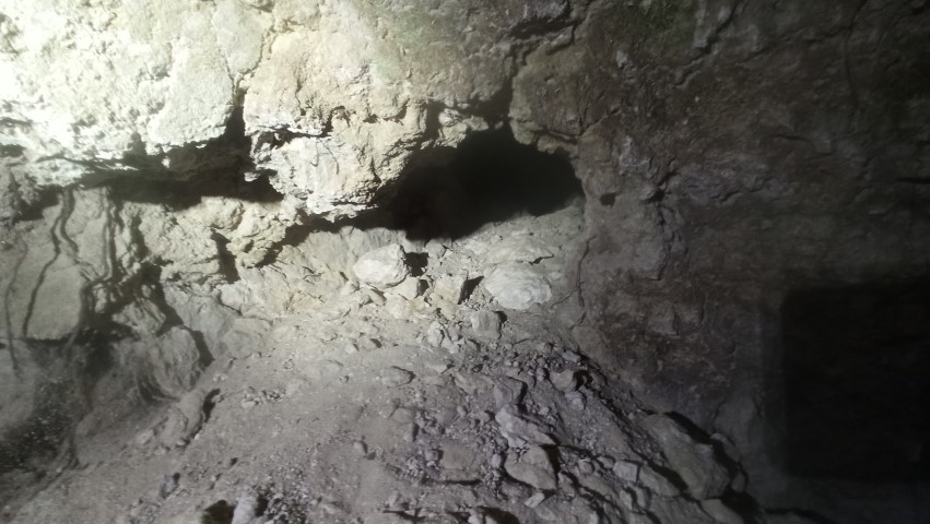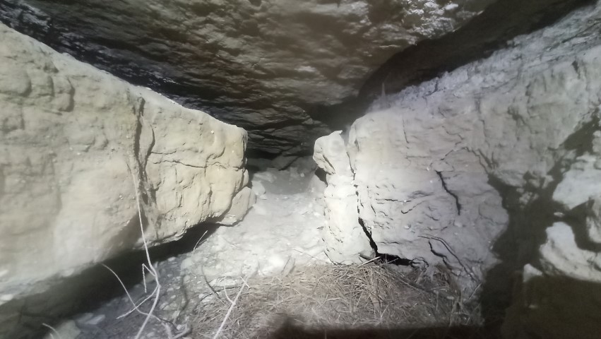 Pel que fa la cova, la galeria d'entrada presenta una direcció de fractura més comuna N40 i en un parell de metres troba la seva galeria conjugada N260, sent la part que més aprofundeix (més de 7m) tot i que en progressió completament estirada. El dia de la topografia vam trobar un jaç a l'encreuament. En quatre metres, una llosa s'entravessa advertint-nos que la cavitat s'ha desenvolupat en una junta d'estratificació i que nosaltres circulem per la part més descomposta i fràgil, mentre que el sostre és una sola llosa de gres gris ben disposada a fracturar-se i sepultar el més intrèpid dels buscadors de tresors. La galeria troba una rampa descendent i un pas infranquejable rere el qual s'intueix una continuïtat força opressiva. Al costat esquerre de l'entrada a la cavitat hi ha un tronc tallat pels dos costats, una pila de sediment i un foradot amb una migrada continuïtat: semblen la prova ideal per assenyalar un d'aquells buscadors de tresors. La cova supera els 10 metres de recorreguts.