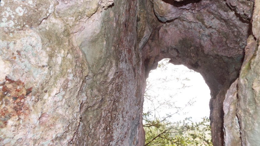 El tret més notable de la cova no és dins la cavitat sinó fora: penjat i obrint-se pas per una escletxa de la cinglera, un roure singular hi viu completament entaforat.