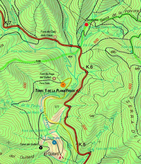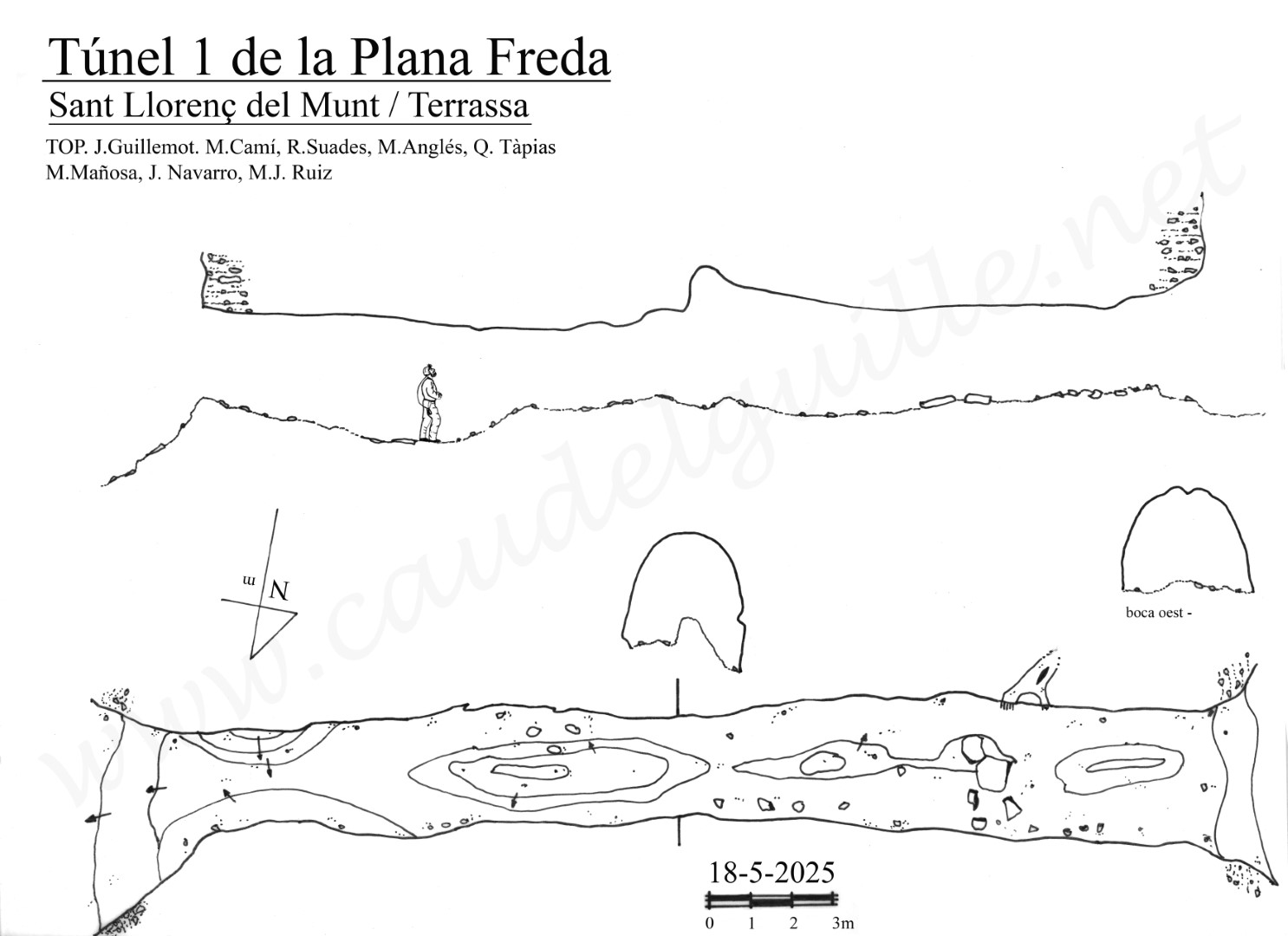 El juny de 2025 el Marc Camí descobria i citava per primer cop els túnels (1 i 2) de la Plana Freda - així com també el forn de Pega del Guitart - situats al sector del Guitart de la Muntanya, dins el terme municipal de Terrassa. La magnitud de les cavitats recordaven moltíssim la del conegut túnel del Guitart, amb la notòria diferència que les novetats no estaven excavades en pissarres sinó en paquets de graves amb sorres llim-argiloses. I per acabar-ho de rematar el Marc Camí també descobria les restes d'una canalització que - per proximitat - duria les aigües cap el Pou de Glaç/Cisterna del Guitart. El Quicu Tàpias també hi va fer batuda i va trobar restes de proto-túnels.