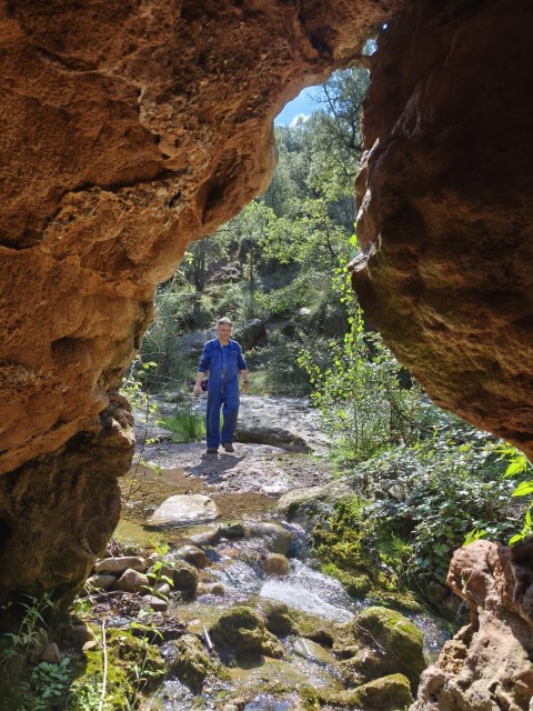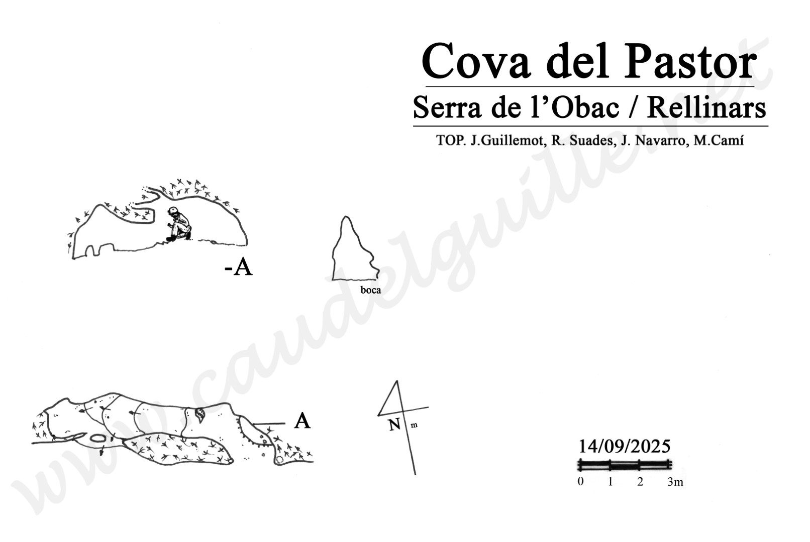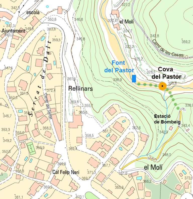 El Ramon Suades havia dedicat una jornada a inspeccionar unes capades de moro prop del Molí de Rellinars i, de passada, documentar la font del Pastor que el Quicu Tàpias havia retrobat temps enrere (2009). Era una font que figurava en els mapes però que ningú sabia ben bé on era el seu emplaçament exacte. El Ramon va fer una bona volta i a mig fer, es va trobar amb aquesta boca de cova que, com en el cas de la cova del Camí de les Fonts, algú n'havia pintat el nom a l'entrada: la cova del Pastor. Una brigada lleugera d'Espeleopringuer hi va fer cap un 14-9-2025, va aixecar-ne un croquis i així ho fem constar aquí.