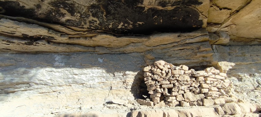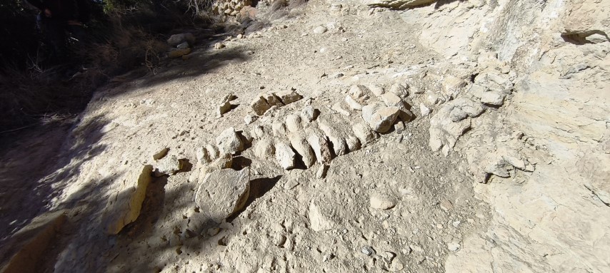 Hi ha cinc forats concentrats a l'extrem d'una de les lloses, un dels quals totalment cantoner a la llosa, com volent formar part d'un encaix. Es van trobar un parell més de forats aïllats entre les grans lloses caigudes. Era tot plegat una forma d'arranjar parapets per contenir una rampa de terra per accedir a les balmes...? eren marques dels picapedrers per trencar pedra i adobar marges de pedra seca...? o en realitat havien estat picats a l'anvers de les lloses, quan aquestes encara formaven part del sostre...?