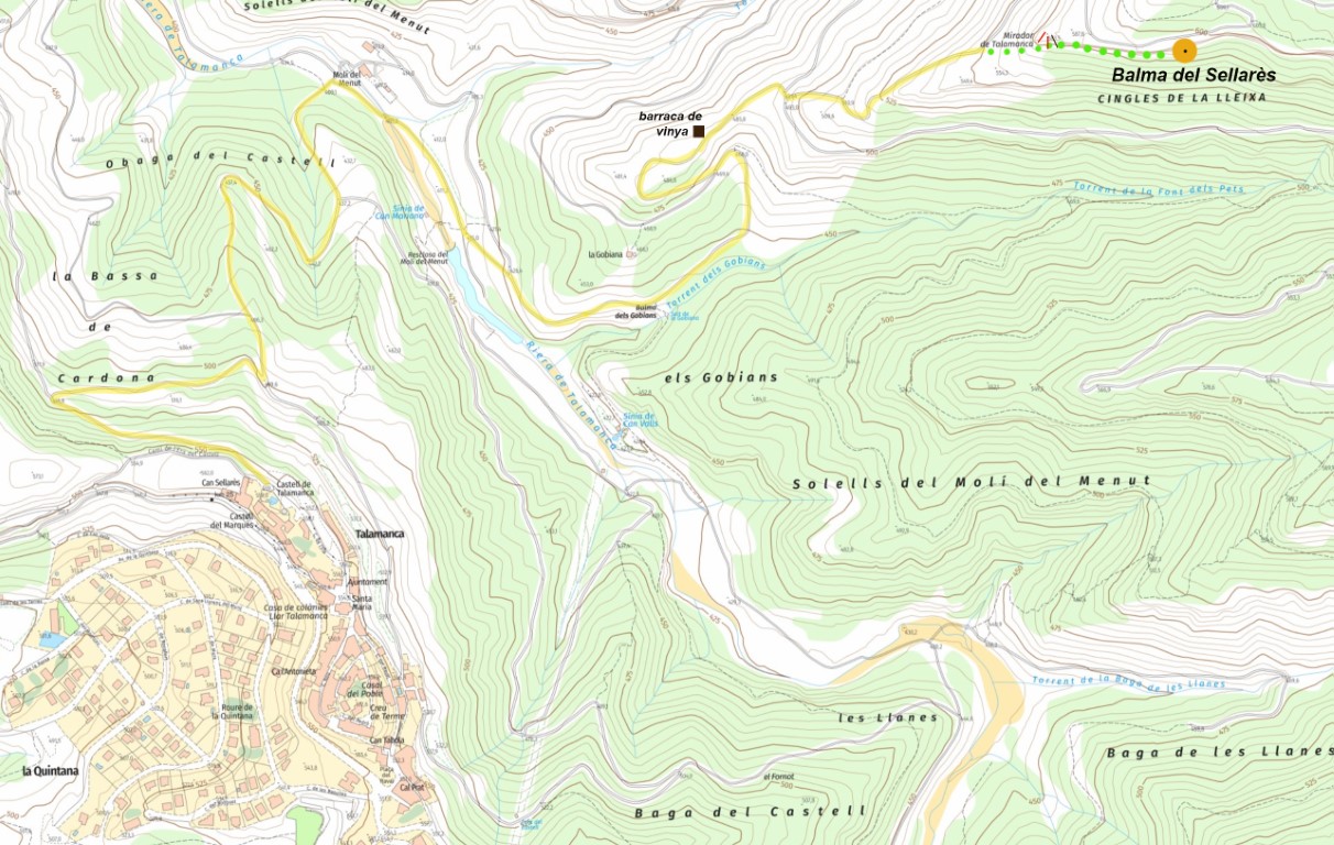 Partint del darrere del castell de Talamanca, seguirem la pista que mena al Molí Menut. Del Molí travessarem la Riera de Talamanca i ens enfilarem pel costat hidrogràfic dret del torrent de Gobians. La pista puja i tomba cap a la nostra esquerra: deixarem el trencall de l'esquerra i seguirem per la pista que revolta i puja al Serrat de la Mansa on hi ha una barraca a frec de camí. Seguirem rectes enfilant la pista cap al nord i quan fa un primer revolt cap a la dreta, pararem atenció a un corriol que surt per la nostra esquerra, que ens enfilarà cap a la punta rocosa del Mirador de Talamanca. Un cop a peu del mirador, resseguirem a peu de cinglera cap a la nostra dreta. Passarem de llarg l'esquelet del que havia estat un parament a peu de paret, travessarem un tram llarg força abalmat (a qualsevol altre lloc del parc i per molt menys, aquests tram balmat a la cinglera del Sellarès, ja tindria nom!). Seguirem a peu de cingle direcció est fins a trobar un munt de lloses per on podrem remuntar fins a la balma de la Llosa (esquerra) i la balma del Sellarès (dreta), que es troben alçades un sis metres per damunt del peu de cingle.