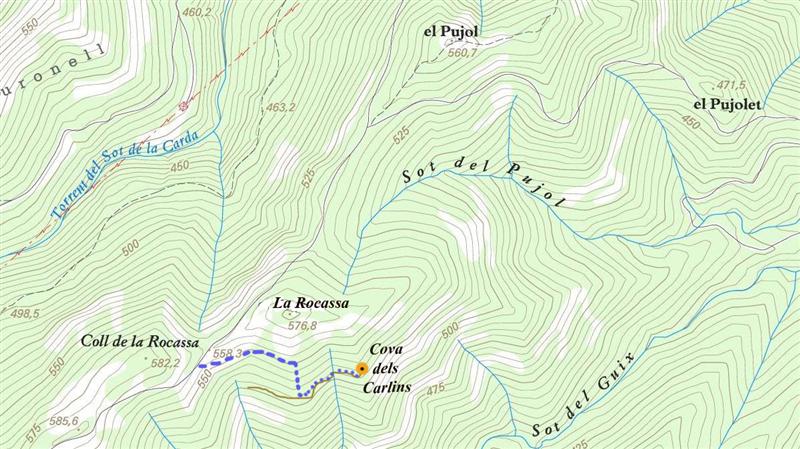 Arribats al Coll de la Rocassa, recularem just per sota la Rocassa i travessat el primer torrent baixarem fins a trobar una primera pista de desboscament abandonada que planeja per aquest sector. La seguirem a la nostra esquerra. Travessarem un torrent i en el proper tombant i en el mateix lloc on la pista fineix, trobarem la cova a tocar de la pista, ben bé a sobre.