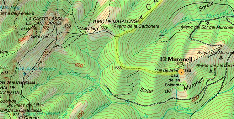 Partint del Mas de l'Illa farem camí pel carener homònim en direcció al Coll Llarg. Prendrem el trencall a la nostra esquerra amb la intenció de fer el cim del turó del Muronell, cim que està separat de la carena per una petita i estreta canal que forma un ressalt. Nosaltres seguirem pocs metres la canaleta a la nostra dreta. Aviat trobarem una de les dues boques que té el curiós cau de les Foixardes.