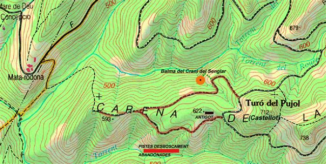 Des de l'Alzina del Sal·lari pujarem al coll de Boix i d'allí prendrem la pista de Matarrodona fins arribar-nos a peu del turó del Pujol (recentment rebatejat 'Castellot'). Quan voregem el costat oest d'aquest turó, dues antigues pistes de desboscament (només dibuixades al mapa CET 1987) van a trobar la pista on som, per la nostra esquerra. Prendrem la situada més al nord. El trencall està passat un torrent, la pista de desboscar voreja pel costat nord d'un petit carener, i tomba a la nostra esquerra. Abans que la pista faci un altre tomb decidida a trobar el torrent, sortirem per la nostra dreta i baixarem com podrem per situar-nos a peu de cinglera. La balma es situa sota el saltant d'aigua que fa el mateix torrent. Aneu en compte perquè sota la cavitat encara hi ha una mica d'estimball.