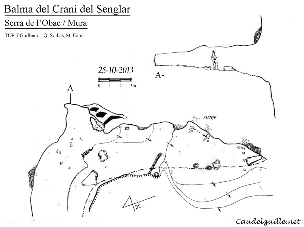A banda del típic balmat que fan els saltants d'aigua quan travessen els nivells carbonàtics, la balma del Crani del Senglar també aprofita una diàclasi N280 que coincideix amb la part més profunda de la cavitat (10m) i també amb el sostre més concrecionat. La presència dels carboners queda documentada per la ceràmica moderna ennegrida, per les evidències de fogaines i, possiblement, per les restes d'un parament a la part més profunda. És molt probable que el degoteig de les formacions fos aprofitat d'antic per recollir aigua en una olleta, una tradició que els carboners van mantenir ben viva fins el segle passat.