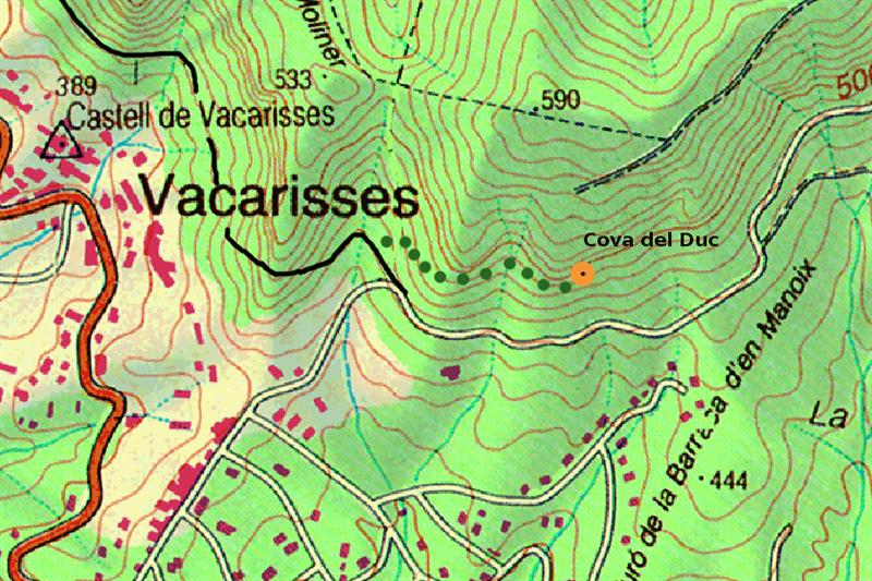 Sortint del poble de Vacarisses en direcció a la carretera dels Caus, la carretera fa un primer revolt a la dreta creuant un torrent. Passada la corba neix una pista a la nostra esquerra que està tancada amb cadenat i que recula cap el torrent que havíem travessat. Abans de tornar a creuar el torrent sortirem per la nostra dreta i remuntarem el turó decantant-nos cap a llevant sense arribar, de moment, a peu de cinglera. Creuarem els dos ramals de la capçalera d'un torrent i tot seguit pujarem a peu de cinglera i reseguint-lo cap a llevant trobarem la boca penjada.