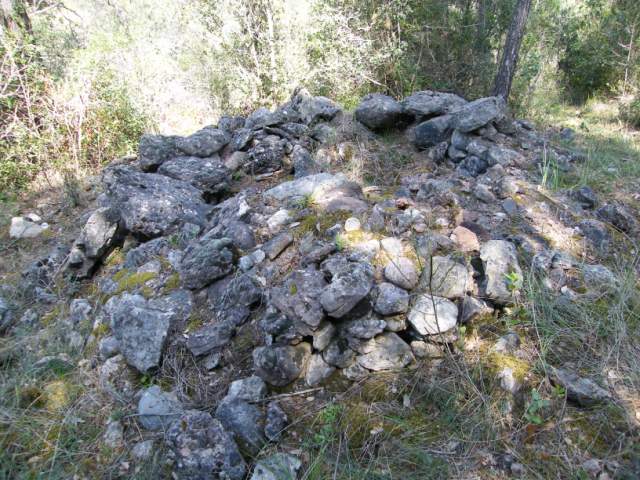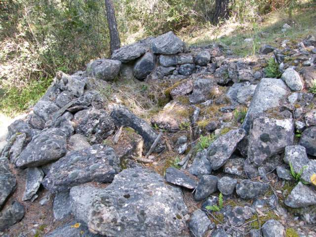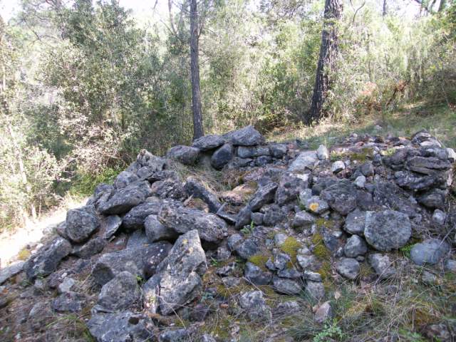 És com un 'kit' de barraca de vinya per muntar, totes les pedres apilades en rotllana: primer cal trobar la tapadora, el dintell, les més planes que acompanyen la tapadora, les més grans per la base, les petites pels reompliments etc. Sembla clar que l'entrada mirava a ponent-nord. El muntatge ve tot complet, excepte pel detall que...no hi han instruccions. No es pot fer servir ciment, ni cola ni cap amalgama: és un kit de pedra seca per muntar, no un prefabricat de totxana! El nom? qualsevol li anirià bé, però si n'hi ha una aprop que es diu del 'Mussol'... a aquesta li podrien posar p.e. de l'Òliba...o no? Bé, aquesta no és, de ben segur, la part més complicada de la barraca, perquè segur que ja la tenen batejada. Potser aixecar aquesta barraca seria una bona ocasió per formar i mostrar el treball a d'altres colles que es puguin sumar a la iniciativa de recuperació del patrimoni rural d'aquestes contrades. La situació aproximada d'aquesta barraca esfondrada és aquí. Una bona opció és fer l'itinerari no. 5 que ens proposa l'Òscar Masó al seu llibre Descobrint la Castellassa de can Torras, Ed. El Farell (p. 88), on podreu aprofitar per trobar un parell d'avencs de la zona i visitar els magnífics pins pinyoners.
