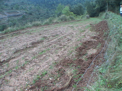 Visita i segona topografia de la cova Cendrera, bo i passant per la roca i barraca del Bolet. Segona topografia perquè la primera ... va desaparèixer. Una feinada pels 20 i escatx metres que té! Dinar a l'ombra de l'alzinar, vora la cova. Temperatura d'estiu. Ni un soroll, ni vent. Fins i tot els dos gatjos que s'estaven esbarallant, han deixat de fer-ho. Visita a la magnífica barraca quadrada del Sot de les Esglésies. Li falta només la tapadora i arreglar la part del dintell, que no sembla trencat tot i que ha caigut amb part de les pedres que l'acompanyaven. Les petxines cantoneres són al seu lloc. A dins té dos calaixos a mitja alçada. I això sí: pels volts, ni rastre de feixes ni marges. Una molt bona troballa del Quim. Davallem passant per la barraca i la font de la Baga de la Vila i tornem al cotxe. De la casa de La Vila ens travessa un escurçó que baixa al torrent. Curiosament el Quim m'havia explicat com fa poc, el Manel del Muntanyenc ha salvat la vida després que de tornada de la Mola un escurçó el mossegués amb tanta força, que no el podia retirar del tou de la mà. No l'havia vist quan li va posar el palmell al damunt, ni tampoc havia vist que hi havia una l'altra escurçó a tocar. La fiblada gairebé elèctrica li havia deixat el braç dret - preferible que no pas l'esquerre segons el metge del Clínic de Barcelona que el va atendre - completament insensible. Va arribar a la mútua de Terrassa amb bona part de la pell del cos amb un to ennegrit i amb part de la columna vertebral afectada. Per sort del Manel, tot ha quedat en un ensurt, i l'escurçó mossegador dins un pot de formol. De vegades a les serps, l'estratègia de la immobilitat els falla.