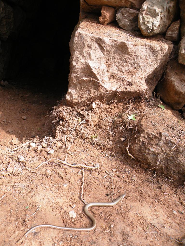 La part més afectada de la barraca 356, després de retirar els avellaners que segellaven l'entrada, era el muntant que havia quedat desplaçat per l'efecte dels arbres. La primera idea era situar uns puntals sota la llinda i a l'interior i d'aquesta forma poder redreçar el muntant sense haver de desfer res més. Però a l'hora de la veritat, quan es situava el puntal sota la llinda, el muntant i la llinda van aprofitar per desmuntar-se sense previ avís. Per sort, ningú va prendre mal, i la barraca tot i haver perdut la llinda i un muntant, restava intacte. Amb molta cura es va anar refent el muntant, aquest cop ben lligat amb la paret, es va resituar la llinda i es va reconstruir la part de la façana. I el resultat aquí el teniu. Una barraca molt ferma, envoltada d'unes feixes amb pedra provinent de la voladura de la carretera a Gallifa, i la proximitat de l'aigua del torrent del Burc. Més amunt, seguint el corriol, podeu trobar passeres, una altra barraca enrunada, un engorjat amb dues basses, i una mena de corralot de pedra seca compltament envoltat de boixos. De moment, la renovada barraca ja ha rebut la visita d'inspecció d'aquesta llisona (Anguis fragilis) que també es coneix amb el nom de serp de vidre, noia, lliseta, vidriol, llinosa. El cas és que aquesta sargantana sense potes, sembla haver aprovat l'obra i ja ha decidit instal·lar-se a les parets de la barraca. A tots els participants (no surten tots a la foto): la llisona es treu la cua i jo em trec el barret!