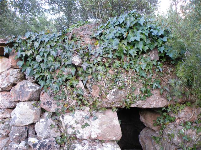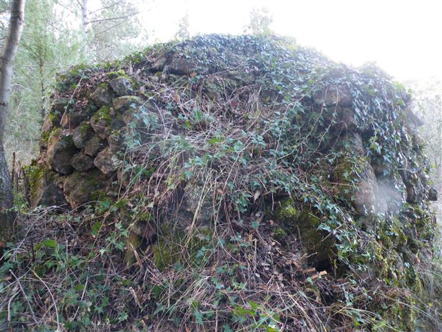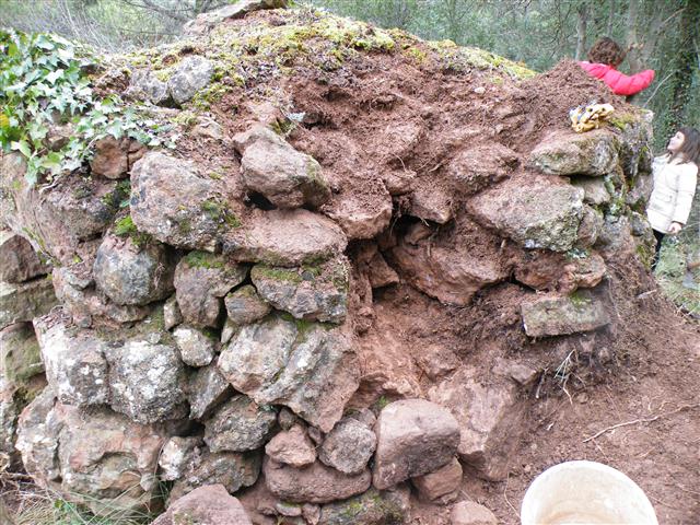 Segons com, restaurar una barraca de zero, una completament en runes, pot arribar a ser més senzill que restaurar-ne una de parcialment tocada. Si es vol mantenir l'estil original sense malmetre la part sencera, restaurar una barraca pot acabar sent una mena de trencaclosques on cal cercar les peces, sovint enterrades pels volts de la barraca, i situar-les al seu lloc. I això tampoc és fàcil. El 'lloc' ara sol estar ocupat de terra, arrels que cal treure amb compte, molsa que fa pena arrencar. És una tasca de 'pinzellet' més pròpia d'arqueologia que de mestre d'obres. I sovint passa que acaba faltant pedra. Suposem que els constructors originals, a més de conèixer millor l'ofici, fèien avançar les filades de forma valenta, de vegades fent volar més d'un terç la llargària de la peça, tal volta comptant que les barraques rebrien un ús i un manteniment habitual en cas que fes falta. Tot plegat guiats pel que devia suposar un considerable estalvi de feina i diners. Aquest cap de setmana el grup Ballestar de pedra seca de Sant Llorenç Savall s'ha embrancat en la restauració d'una barraca ben conservada, la 195 a La Serra, situada a tan sols 91 metres de la darrera barraca restaurada del grup, la 197. Es tracta d'una barraca que conservava la terra de la coberta, avui majoritàriament ocupada de forma espontània per molsa. A banda de l'habitual estassada (clicar damunt de la foto), tan sols s'apreciaven tres esllavissades que afectaven el contrafort de la barraca. Aparentment semblava poca cosa, però un cop feta la tasca de 'passar el pinzell' es pot apreciar la profunditat dels danys. Amb paciència ha calgut anar reblint l'esllavissada, i aquí no ha passat res. Com podeu notar, a més de molsa, la barraca restava adornada per una bonica heura, que s'ha hagut de tallar a les parts esllavissades i que ha aixecat un viu debat entre els participants, sobre la conveniència o no, de conservar-la. Fins a la data no hem pogut certificar cap barraca enrunada per una heura, tot i que intuïm que a partir d'un cert desenvolupament poden resultar poc recomanables, com en el cas de la barraca 119, a la Vall d'Horta.