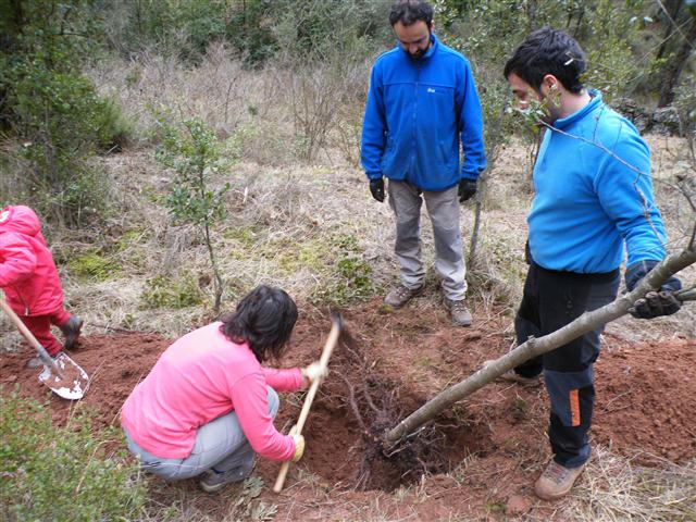 A banda de la barraca 195, part del grup ha seguit buidant la bassa al costat de la 197, a mig metre més de profunditat, sense treure l'entrellat de l'ús original i la forma com s'omplia. Sembla que el fons de roca mare es devia trencar o esquerdar, perdent la seva utilitat i abandonant-se. Més recentment hi va arrelar una alzina que hagut de ser traslladada en arribar l'excavació a nivell d'arrels. L'hem regada en el seu nou emplaçament i en acabar el dia, la pluja ha fet la resta. Continuarà.