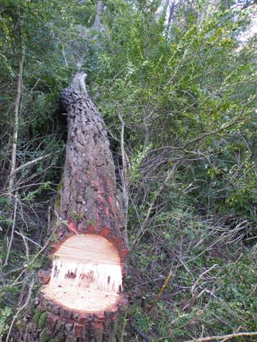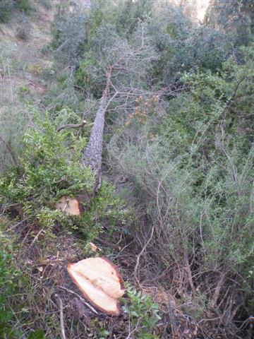 Els vaig sentir de lluny estant. Les motoserres i també els crits, formalitzats en la llengua de Cervantes i variants. Eren sota una línia de mitja tensió. Hi havia no menys de 6 vehibles aturats dalt la serra de la Codina i dins la propietat de La Serra. Tots ells pertanyien a l'empresa de desbrossaments Funuyet, de St Esteve de Palautordera. Potser només va ser una impressió meva, però juraria que semblaven tots contrariats amb l'arbrada i tanta malesa prop de la línia. Pel que vaig anar escoltant, alguns semblava que tallaven els arbres sense avisar o bé sense calcular on eren exactament els companys de treball. Jo em vaig anar allunyant del lloc buscant barraques per altres bandes on no ploguessin arbres. A l'endemà em vaig trobar que els arbres havien estat tallats i abandonats al mateix lloc on havien caigut. La majoria havien aterrat cap a les bandes de la línia però d'altres eren sota mateix del lloc on es suposa que hauria d'estar net i estassat. Van tenir cura de la barraca ja esfondrada B195e i van deixar caure el pi tallat al costat mateix. Una altra barraca per desbrossar però, sembla que ha quedat coberta per una capçada tombada. He llegit que a l'empresa "seguimos estrictos procesos de trabajo' i que tots els seus treballs són 'supervisados por un técnico de zona'.És una pràctica habitual la de deixar in situ els arbres tallats caiguts a tocar d'una línia? És quelcom que es pacta amb la propietat? Jo he vist que en treballs de desbrossament subvencionats per la Generalitat, el troncs dels arbres abatuts han estat fets a trossos i apilats al costat de la pista. Deixo la pregunta a l'aire, per si algú em sap respondre.