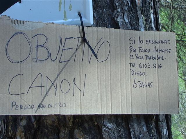 Això és el que li va passar al Diego. Va perdre l'objectiu. Un de marca Canon. El va perdre 'aqui en el rio', al riu Ripoll a l'alçada de la balma de l'Aiguader, prop de Les Marines. Ja ho sabeu, diu que el necessita per la feina. Jo no he vist res però si algú de vosaltres l'heu trobat i voleu trucar-lo cliqueu . El seu anunci, de cartró, té els dies comptats si és que, com diuen, ha de ploure. Em penso que aquí, a la web, no s'arribarà a mullar. Sort, Diego.