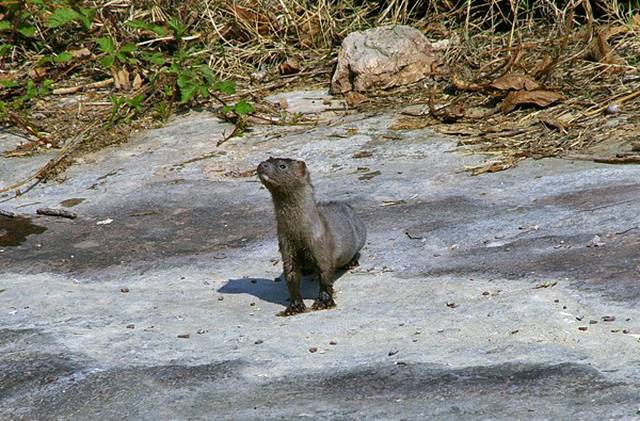 americà (Mustela vison) de Mura. La versió ianqui del nostre turó / fura de bosc (Mustela putorius!), escapat de les granges del Montseny. No volien deixar-hi la pell i ara campen ocupant el lloc dels gairebé extingits turons, caçant granotes, rates d'aigua, cargols, insectes o peixos morts. Fixeu-vos en el , és l'únic distintiu del color negrós-cendrós que té la seva pell. No donarem les dades GPS d'aquest exemplar no fos cas que la bestiola acabés en un menú qualsevol del Parc a Taula. Prou feina té el visó a flairar les aigües fecals de la riera de Nespres, esperant mentre les institucions implicades tenen altres prioritats abans de fer la depuradora de Mura que no troba pressupost de fa anys. Dels 600.00 euros per la ruta dels Tres Munts, no se'n podria desviar alguna partideta, la primera pedra, tenint en compte que és Parc Natural i que la ruta turística ha de passar a tocar de la resclosa ... ?