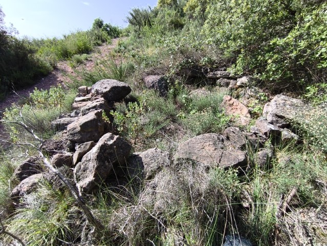 Si abans de baixar pel carener preferiu seguir per la pista, metres enllà acabaríeu trobant al costat mateix del camí una barraca de planta quadrada completament en ruïnes: creiem que per la forma i la poca pedra que hi queda, la barraca devia ser tancada amb bigues i teules, i no descartem que fos molt antiga, fins i tot anterior a la febre de la vinya.
