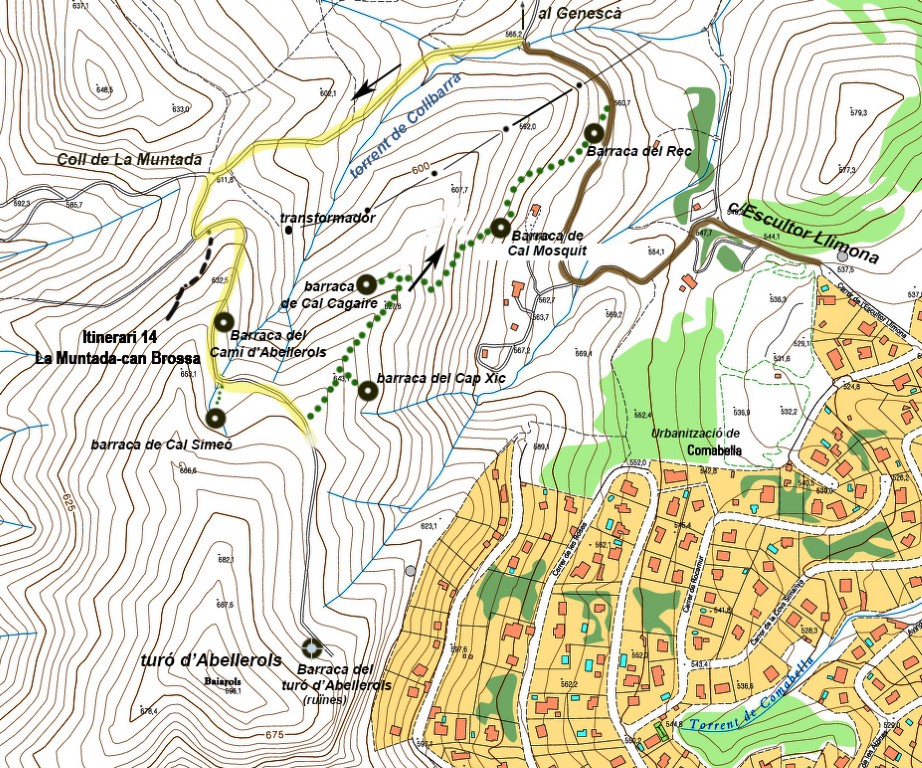 Al límit nord de la urbanització de Comabella, el carrer Escultor Llimona acaba convertint-se en una pista de terra i el seu traçat principal menaria - de seguir-lo sencer - a la casa de pagès del Genescà, tot deixant enrere reductes de la urbanització Comabella - Genescà, en forma de xalets dispersos. La pista travessa una línia de baixa tensió i en creuar un torrent, el paviment passa provisionalment a ser un tram cimentat on hi ha una cruïlla de pistes. És el nostre punt de partida de la matinal. Prendrem el trencall esquerre que amb forta pujada entra al Parc Natural i arriba al Coll de La Muntada (també dit coll del Genescà, depenent d'on es vulgui anar!), on hi ha una nova cruïlla: nosaltres prendrem el trencall esquerre en direcció sud. Immediatament després del primer revolt a l'esquerra, trobarem a la nostra dreta un trencall fitat que connecta amb la ruta de pedra seca de La Muntada - can Brossa. Si prenguéssim aquest trencall, podríem visitar sis barraques - gairebé totes rehabilitades - abans d'arribar-nos a La Muntada.